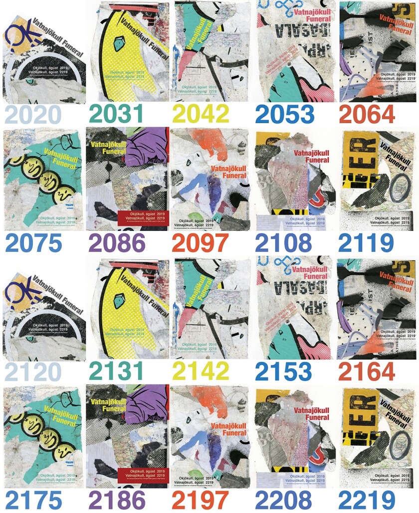 The text concludes with “415ppm CO2,” the ratio of greenhouse gases on earth recorded in May 2019. As residents of the U.S. — one of the leading contributors to global warming — Ostraff and Mowinski were deeply impacted by this message. Together they created posters announcing the funeral for Vatnajökull, the largest glacier in Iceland and presumably the last to go. They printed 12 sets of posters, made from materials collected in downtown Reykjavik last August, with 200 posters per set. Each poster will be exhibited for one full year leading up to 2219. “Theoretically this performative activity will go on until the actual death of Vatnajökull or until there is a reversal in the current trend,” according to Ostraff’s and Mowinski’s proposal.
